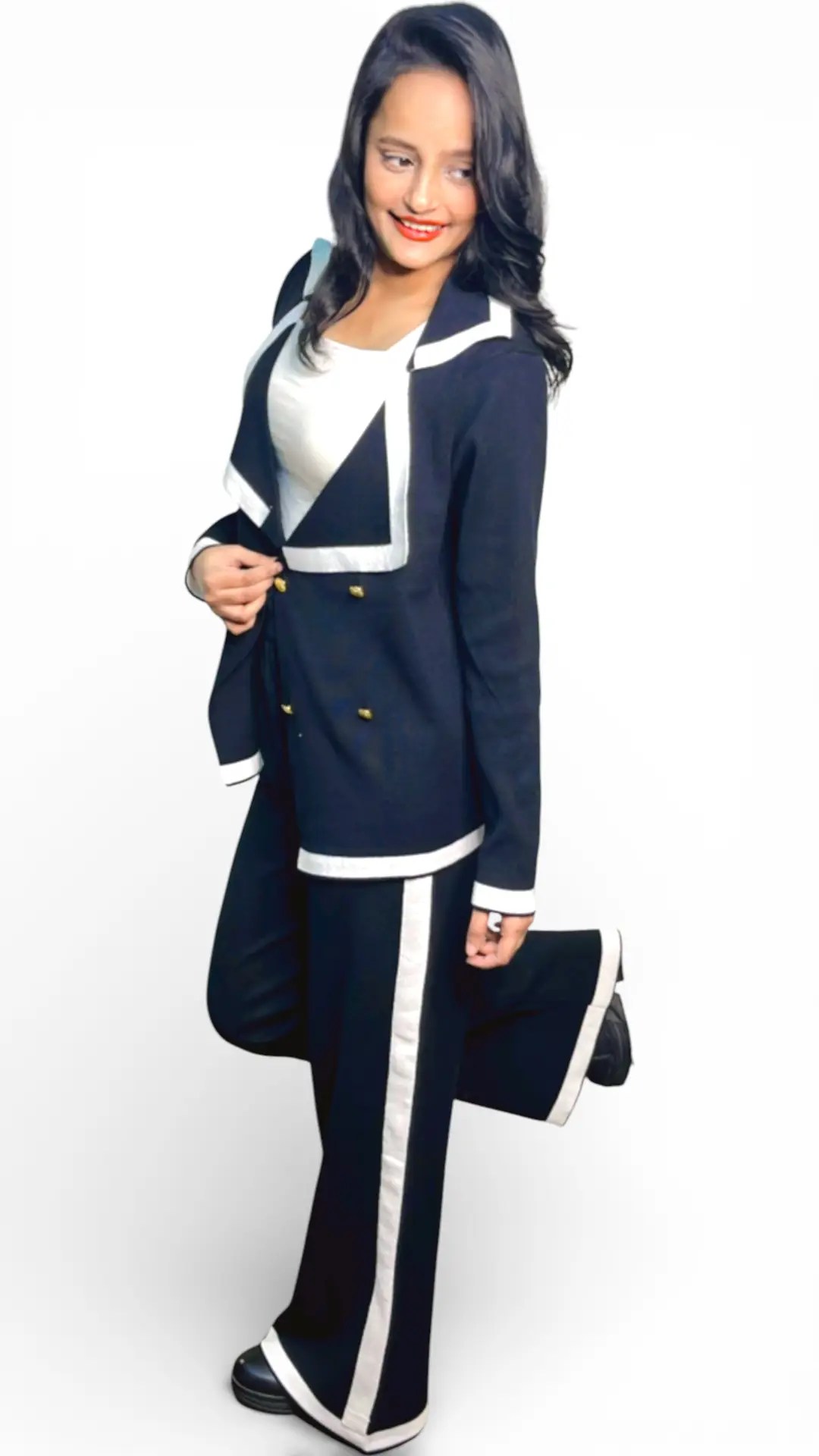 Black and white colorblocked sweater, has V neck, long sleeves, button closure and flared waist hem Black colorblocked mid-rise trouser, has an elasticated waistband with slip on closure and flared hem